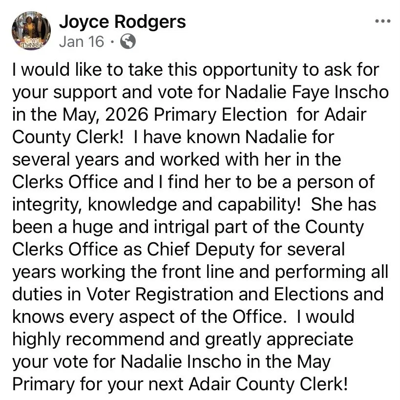 and my co-workers, I officially filed to run for Adair County Clerk on November 5, 2025.