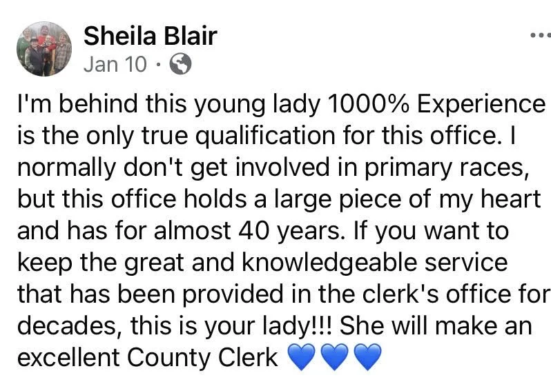 I am currently the Chief Deputy of Elections. I have worked in the Clerk’s office for 18 years. I have been fortunate to work alongside some of the best women I know! Lisa Greer, our current County Clerk has announced her retirement. I have learned so much in 18yrs working with Lisa, Sheila Blair & Joyce Rodgers. These extraordinary women have primed and polished me to step into this lead role. Lisa Greer will begin her well-deserved retirement in 2027.